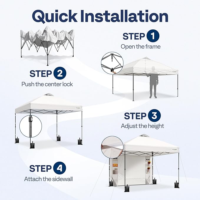 - RELIABLE STEEL FRAME: Engineered with a sturdy frame featuring crossbars and a triangular support structure, this canopy easily supports the side wall's weight; Thicker steel pipes and a secure center-locking mechanism enhance stability and durability, keeping the side wall firmly in place even when loaded with pocket-stored items, giving you peace of mind in any setting
