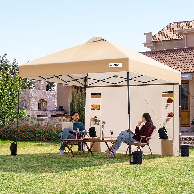VIVOHOME 10x10ft Pop Up Canopy Tent with Sidewall and 6 Pockets, One Push Setup Outdoor Portable Shelter Tent Heavy Duty with Wheel Carry Bag and 4 Sandbags, Beige
