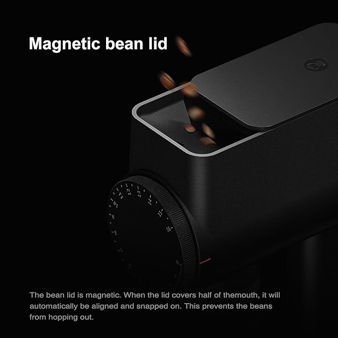 - [ Magnetic Alignment Container ] The magnetic lid ensures a snug fit when covering the bean entrance, Just place it on the base and the container will get alignedautomatically to the center smoothly and accurately. Experi-ence the magic of magnetically aligned containers for yourcoffee beans.