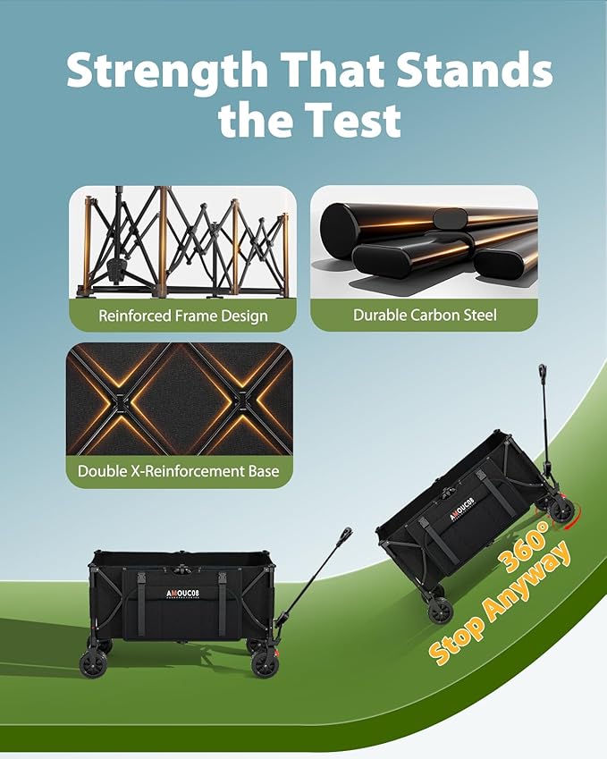 - All-Terrain Mobility with Dual Brakes: Just like an off-road truck needs the right tires, this folding wagon cart is equipped with extra-wide(7" x 4"), 360° rotating wheels that grip sand, gravel, dirt, and grass with ease. Whether rolling through a beachside campsite, rocky trails, or festival grounds, this wagon cart with wheels ensures a smooth and hassle-free journey. Dual-brake system ensures this collapsible wagon cart stays secure even on slopes