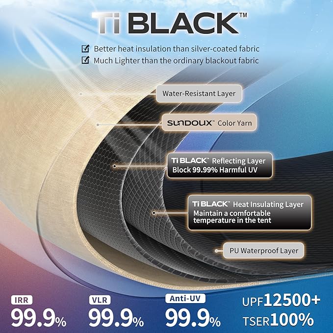 - Superior Blackout Tent Technology: Constructed with 150D TI BLACK TECHNOLOGY fabric, this blackout tent blocks 99.9% of harmful UV rays, providing better heat insulation than silver-coated fabrics while maintaining a comfortable, cool temperature for restful sleep.