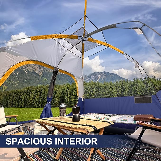 - 【360° BREATHABLE VIEW - MESH ROOF FOR STARGAZING & MAX AIRFLOW】 Wake up to the sky in this breathable large tent! The top large mesh roof offers a breathtaking panoramic view and perfect ventilation. Dual mesh windows and double door mesh panels create a cross-breeze, keeping the air in this 8 person camping cabin fresh and cool all night long. Enjoy the views without the bugs.