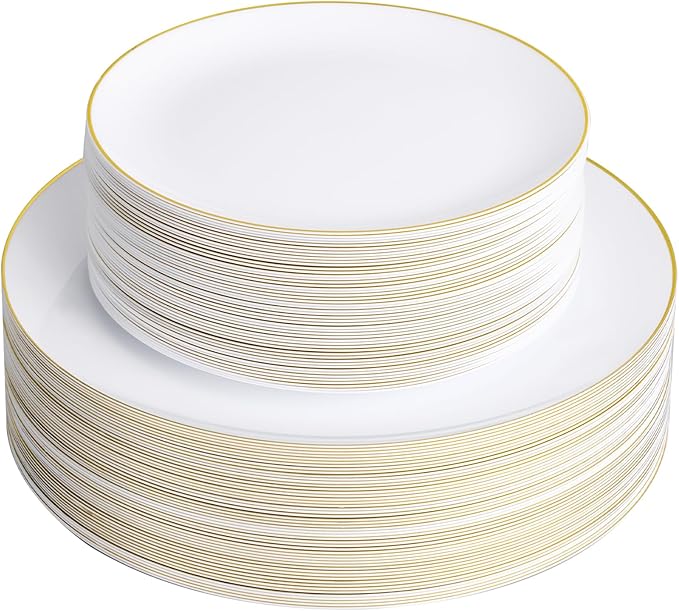 - PERFECT FOR ALL OCCASIONS: Our gold-rimmed wedding plastic plates are designed to add a touch of elegance to any event, whether it be a party, birthday, dinner, wedding, baby shower, business gathering, Thanksgiving, Halloween, or Christmas. These disposable plates are certain to impress your guests.