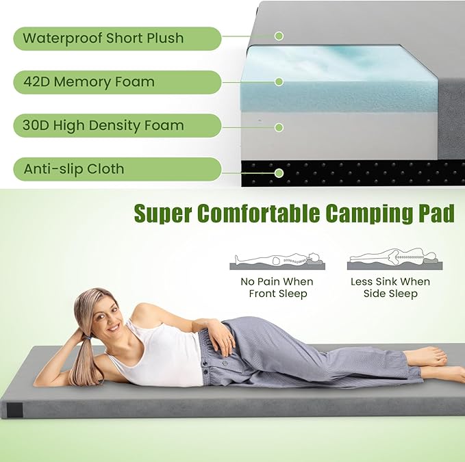 - Comfortable for Sleeping: The 2.5" thick foam camping mattress is filled with 1/3 soft rebound memory foam and 2/3 high-density base support foam, bringing you the maximum comfort. No matter which sleeping position you prefer, it can suit your needs.