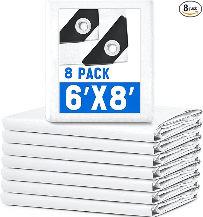 8 Pack 6 x 8 ft 5.5 Mil Large Tarps Heavy Duty Waterproof Tarp Multi Purpose Tent Cover for Home Boats Cars Camping Patio Furniture Roof Emergency Rain Protective Cover, White