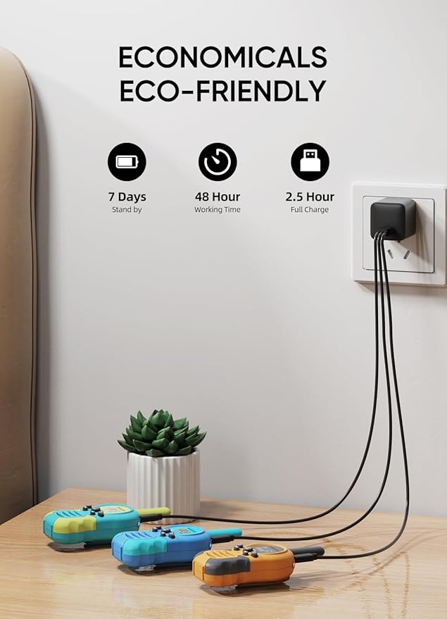- RECHARGEABLE AND ECO-FRIENDLY: Say goodbye to purchasing and changing batteries frequently! Our rechargeable kids walkie-talkies are equipped with a non-removable rechargeable lithium battery and a 3-in-1 USB charging cable (Adapter not included) that can charge two walkie talkies at once. The battery boasts an impressive 48-hour talking time and 7-day standby time.