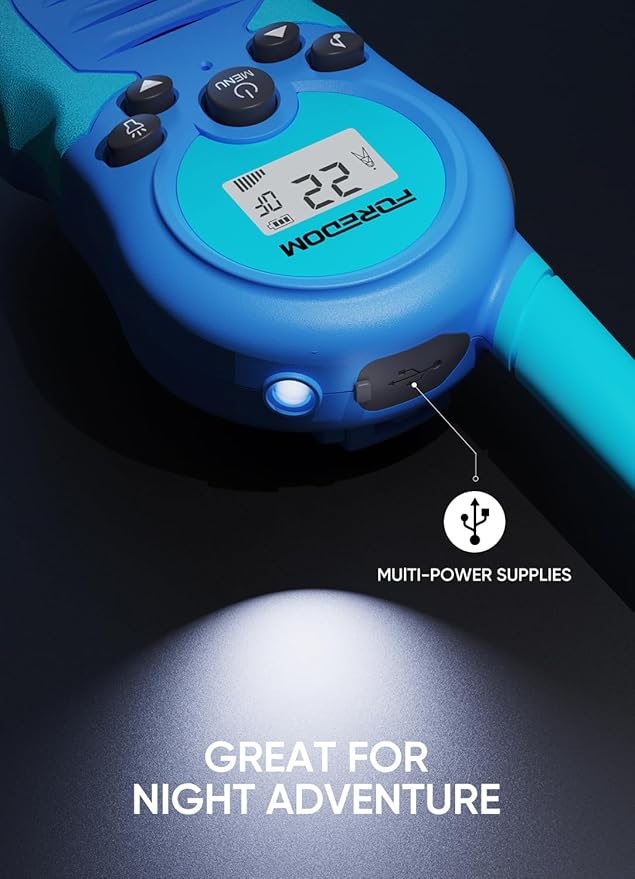 - CHILD-FRIENDLY DESIGN: Made from safe and durable anti-damage plastic, our walkie talkies are lightweight and easy for children to handle. The push-to-talk button and backlit screen with a flashlight provide extra fun. With the convenient belt clip on the back, children can attach the walkie talkie to their clothing or anywhere they like.