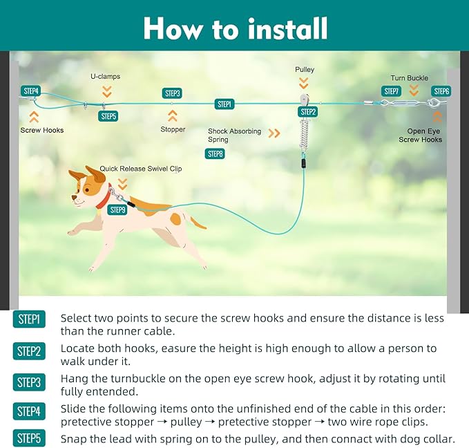 - EASY TO SET UP: Our LUFFWELL dog runner arrives with everything you need. Follow our clear, step-by-step instructions, and you can have it securely installed and ready for action in under 15 minutes. Spend less time setting up, and more time watching your happy pup explore