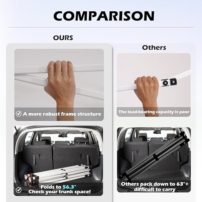 - Easy to Set Up - Effortlessly set up the tent in minutes with 2-4 people by following these steps: 1) Unfold the frame, 2) Install the Overhanging Support Rods, 3) Secure the canopy top, 4) Adjust the height to your preference from three available options: 74.8”, 78.7” or 82.7”(Tips: Grasp the top sides of the frame with both hands and push it up to make it easier to lock.), 5) Anchor the canopy with sandbags and stakes for stability.