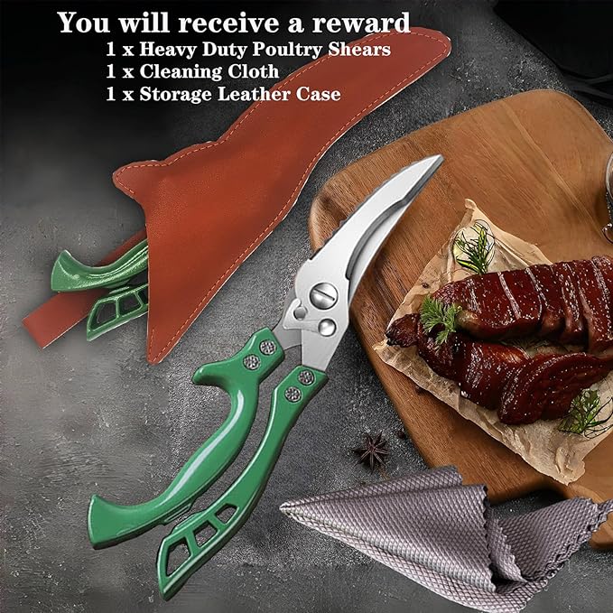 - Heavy-Duty kitchen shears:Crafted from high-quality materials,Crafted with durable antirust stainless steel blades. These green heavy duty kitchen shears are built to last, ensuring reliable performance for years to come. Upgrade your kitchen experience with our heavy-duty poultry shears designed for effortless cutting and trimming of poultry, meat, and other food items. These versatile all-purpose kitchen scissors boast sharp, durable blades that slice through tough materials with ease.