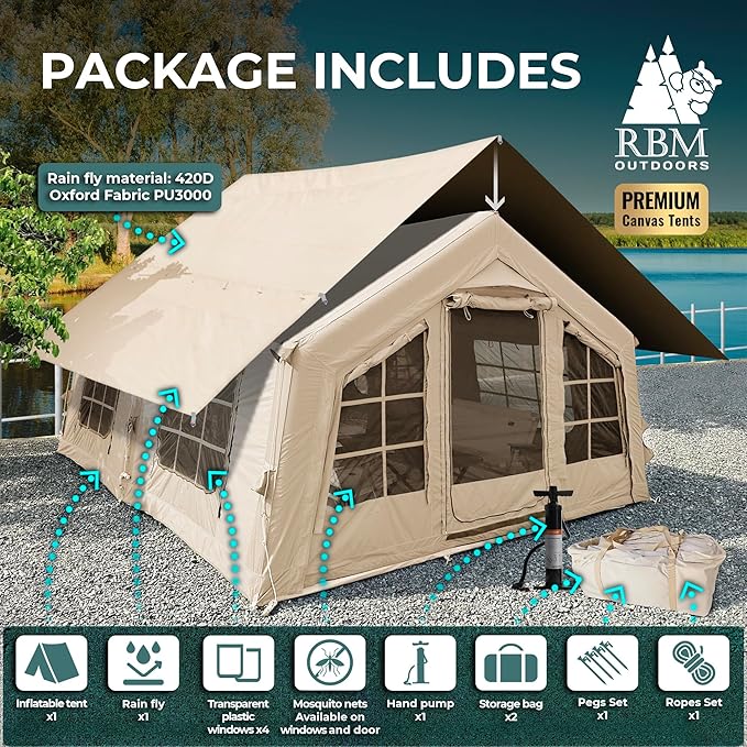 - Air tents for camping adult: The RBM Outdoors inflatable tent house for camping is made from canvas, offering superior durability, breathability, eco-friendliness, and resistance to all weather. Canvas tents for camping reduces condensation, retains heat better, and is crafted from more sustainable materials compared to Oxford tents. Capacity - up to 8 (8 in sleeping bags).