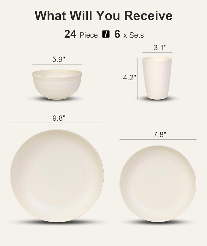 Quatish 24 Piece Plates and Bowls Sets for 6, Unbreakable Dinnerware Sets, Plastic Dish Set for Camping, Dishwasher Microwave Safe, Outdoor Kitchen and Apartment Dinning RV Essentials, Beige
