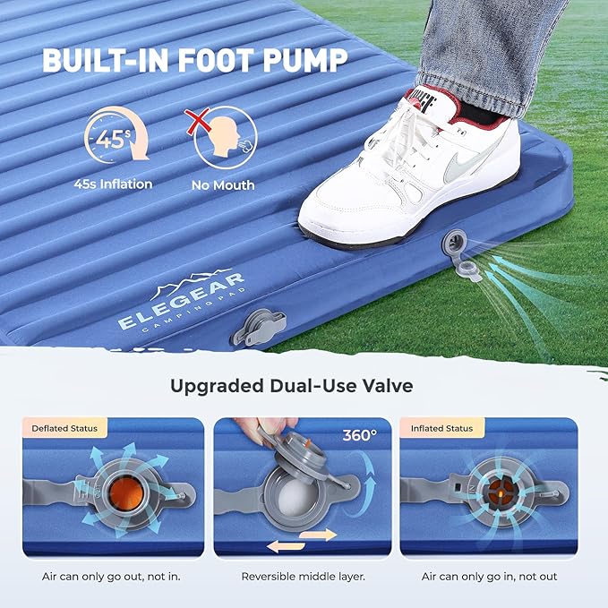 - Effortless Built-in Foot Pump: Inflation has never been easier! Our foam camping pad is equipped with a convenient built-in foot pump, allowing you to inflate it in just 45 seconds with minimal effort. The dual-layer deflation valve ensures quick and hassle-free deflation, enabling you to pack up and move on to your next destination in no time. Enjoy a seamless camping experience without the fuss of traditional pumps.