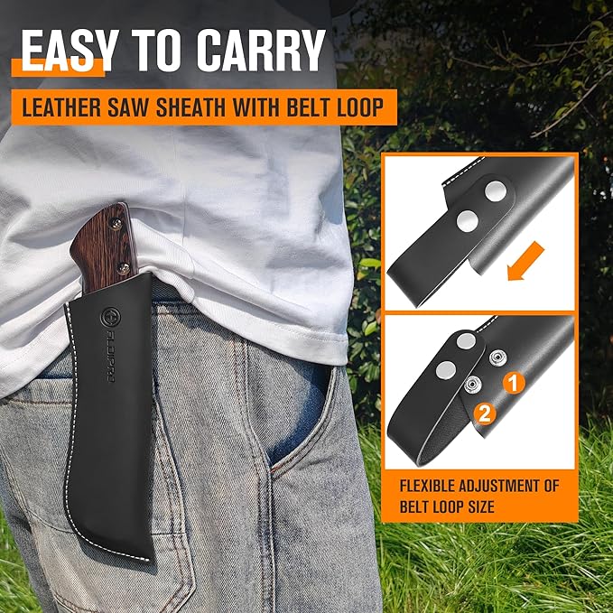 - ✅【PORTABLE BLACK LEATHER SHEATH】This small saw for wood includes a black leather sheath equipped with two adjustable buckles on the back for customizable width and easy wearing. It allows for convenient portability, making tree trimming survival saw accessible anywhere