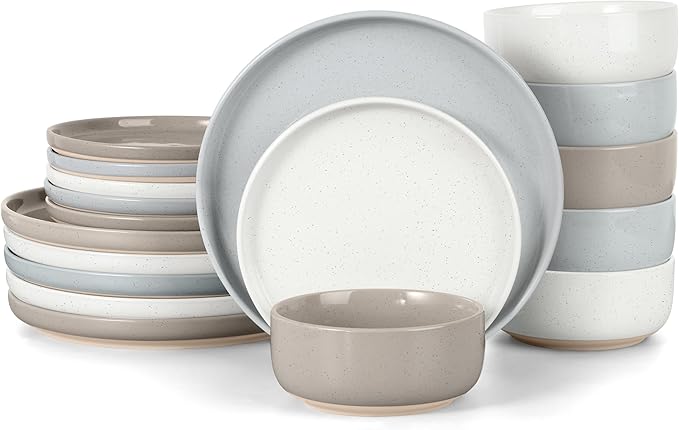 - Premium Stoneware, crafted from natural clays and glaze finish, the stoneware dish set is fired at 2400℉ high temperature for 13 hours, the plates and bowls sets are completely lead-free and cadmium free, no harmful substance leaching into the foods