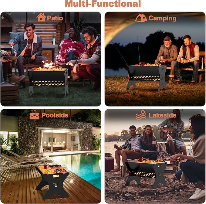 - 🔥【Multiple Uses】If you are an outdoor person then this grill is a must have, this multi-scenario charcoal grill can be used as outdoor fire pit, BBQ grill, bonfire pit, perfect for backyard, camping, bonfire, campfire, outdoor entertaining, beach, parties. Ideal gift for your friends or family.