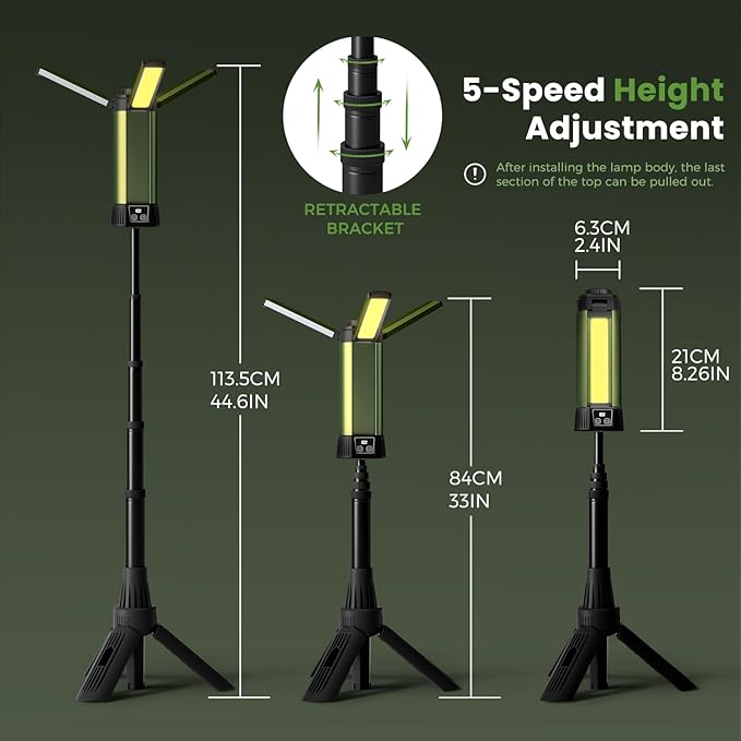 Rechargeable Camping Light with Stand: Cordless Work Light Kit 3 Page Head 500/1000/2000 Lumen 3500/6500K - Dimmable 6AH Camp Lights with Detachable Tripod,Hooks and Carrying Bag(Green-S)