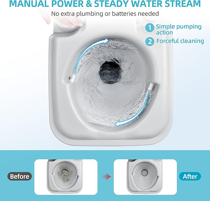 - Dual Outlet Water System: Experience powerful, effective flushing with this RV toilet’s dual water outlet system. It ensures every corner of the bowl is spotless, with no plumbing needed, just a pressurized flushing pump for easy, thorough cleaning