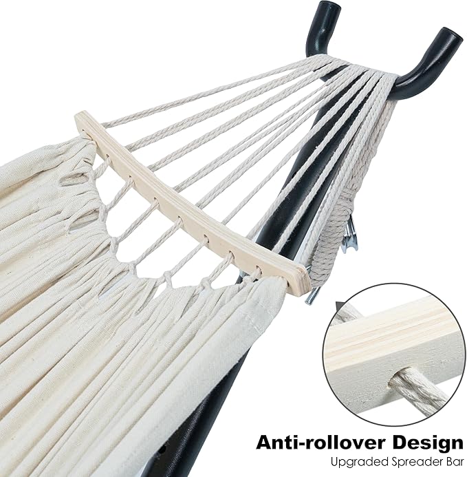 - ✅ANTI-ROLLOVER SPREADER BAR: Upgraded hammocks with anti-rollover curved spreader bars design, the 9 thicker cotton ropes are evenly distributed to make the hammock more stable, ensuring a balanced sleeping experience.