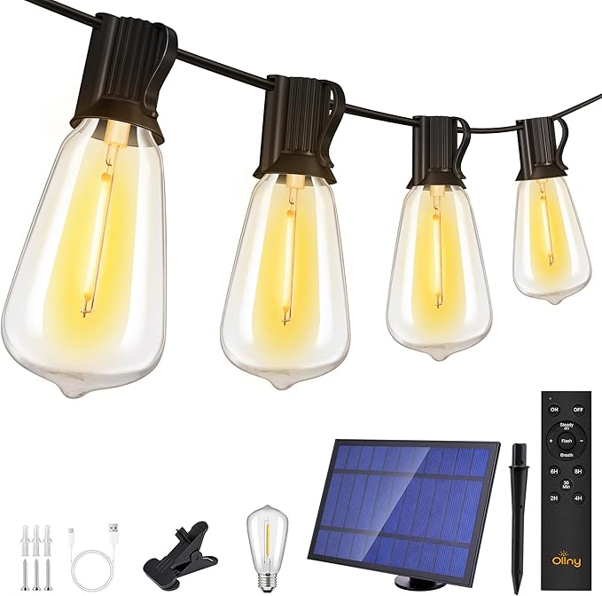 Ollny 15+1 LEDs ST38 Solar String Lights, 30 FT USB & Solar Dual Charging Outdoor String Lights, 3 Modes 5 Timers 10 Brightness 2200K Waterproof Patio Lights for Porch Garden Market Bistro Camping