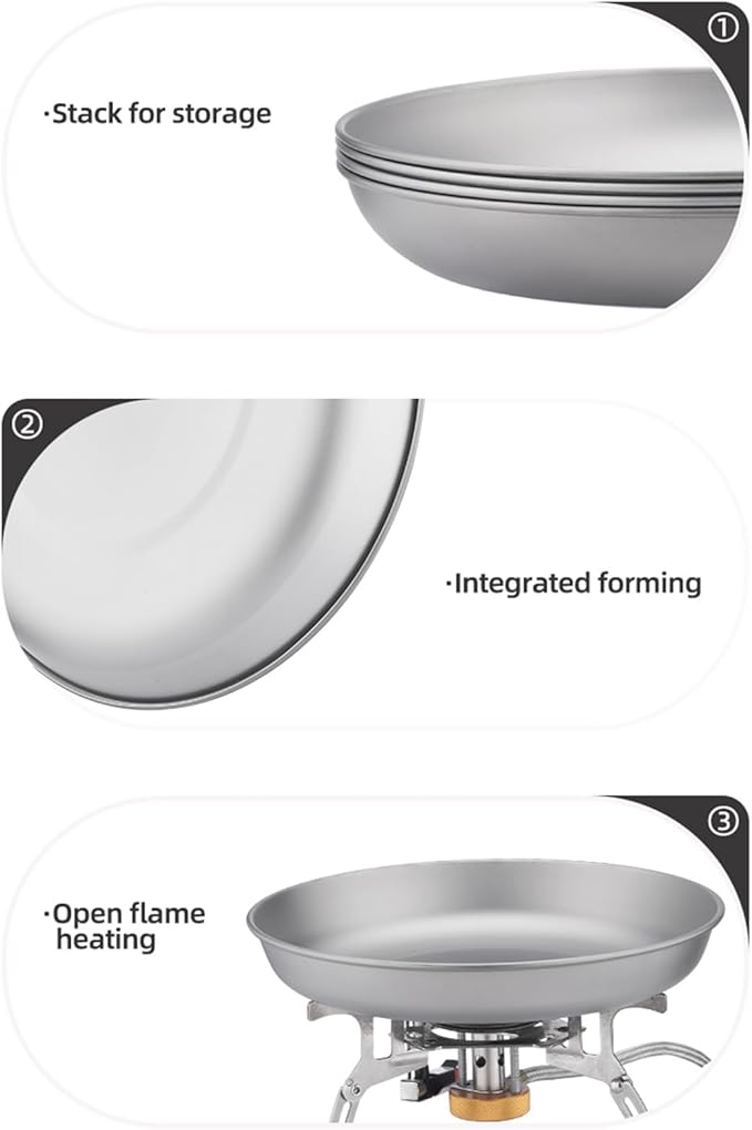 - [ Lightweight & Durable ]: This ultralight titanium camping plate utensil set totally weighs only 210g/7.4oz, durable, and corrosion-resistant and lasts for years, it imparts no taste and odor on food or beverage, transfers heat well, cleans quickly with water, even after being heated for a long time, it has not warped in any way.