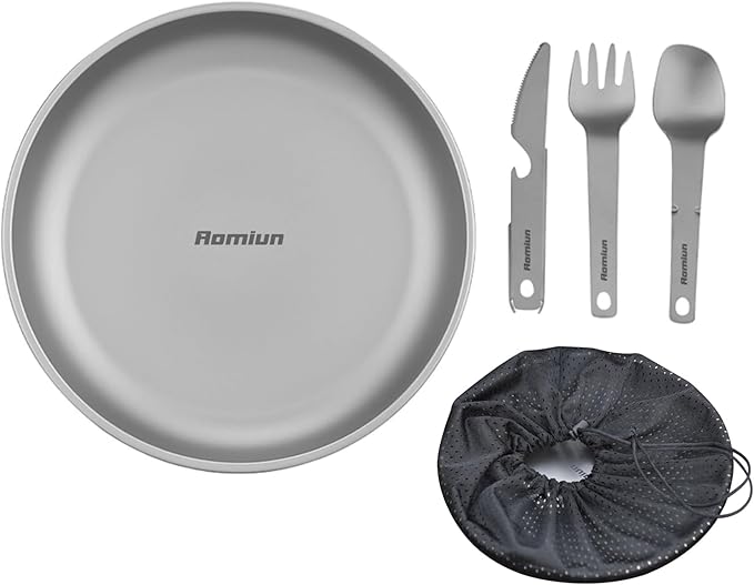 - [ Quality Material ]: Aomiun titanium camping plate utensil set of 4 is made of 99.9% titanium, it resist to acid & alkali corrosion that body-friendly and environmentally, the titanium material ensures no metallic taste, preserving the natural flavors of your food. It can be used directly over a stove or directly over the campfire, great for camping, hiking, backpacking, outdoor adventure and survival.