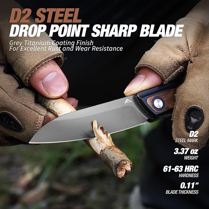 - PREMIUM MATERIAL: The blade of the pocket knife is crafted from D2 steel and coated with grey Titanium, offering great sharpness and corrosion resistance. With a hardness of 61 to 63 HRC, the knife is good for cutting, stabbing and peeling during daily tasks.