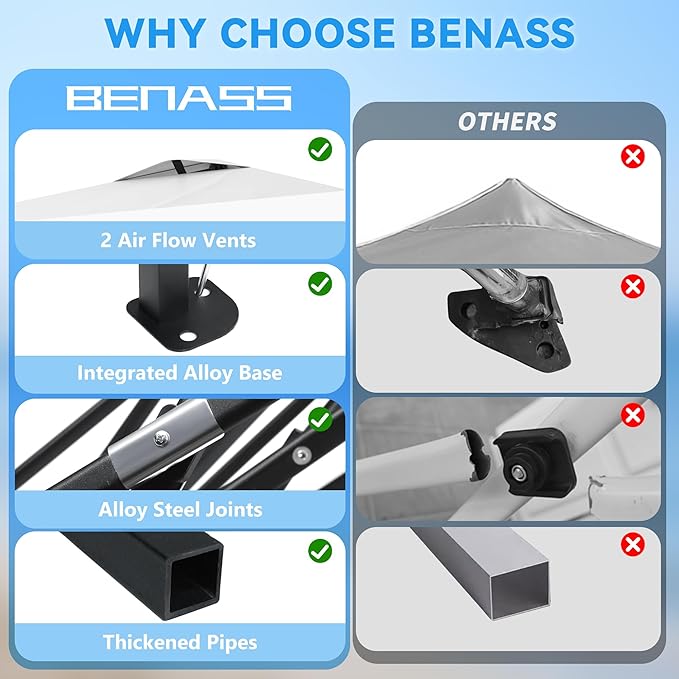 - Ideal Size & Large Room - We use straight leg design to maximize the use of space. Overall size is 10'L x 10'L x 9.2'H (8.53'-8.86'-9.2'). It's large enough for 8-10 person and enough to put tables, chairs, and others, perfect for party, camping, event and vendor