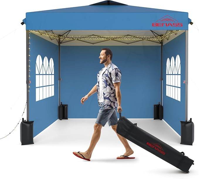 10x10 Pop Up Canopy with Sidewalls, Easy Up Canopy Tent, Heavy Duty Tents for Parties, One Person Set Up Event Tent, Light Blue