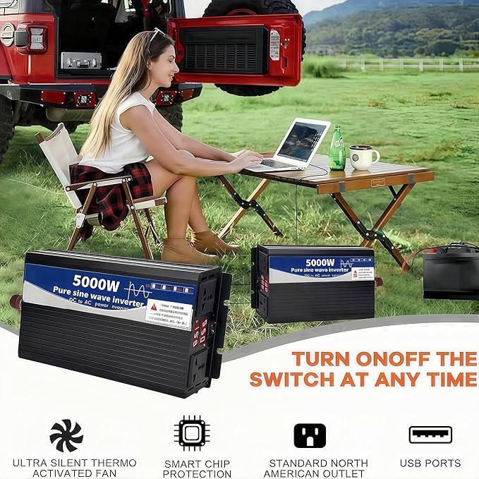 - 1.Power Inverter: This is a real pure sine wave inverter, stable and efficient. 3500W of continuous power, converts 60V DC power to 110V AC power, this power inverters features 2 standard North American 110V AC power outlets, can be used forem, ergency, travel, camping or workplace AC appliances or large electrical devices such as TVs,