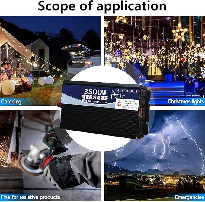 - 1.Power Inverter: This is a real pure sine wave inverter, stable and efficient. 3500W of continuous power, converts 72V DC power to 110V AC power, this power inverters features 2 standard North American 110V AC power outlets, can be used forem, ergency, travel, camping or workplace AC appliances or large electrical devices such as TVs,