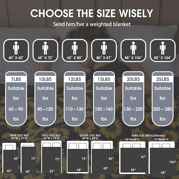 - SHOPPING GUIDE: Heavy blankets are available in 40"x60"throw size for kids,48" x72"twin size, 60"x80"queen size, 80"x87"king size, 104"x88"california king size, with 12lbs, 15lbs, 20lbs&25lbs weighted blankets respectively. You can choose freely according to your own needs, give you a variety of options.