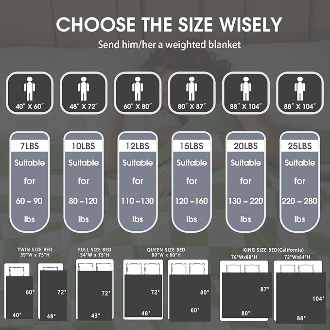 - SHOPPING GUIDE: Heavy blankets are available in 40"x60"throw size for kids,48" x72"twin size, 60"x80"queen size, 80"x87"king size, 104"x88"california king size, with 12lbs, 15lbs, 20lbs&25lbs weighted blankets respectively. You can choose freely according to your own needs, give you a variety of options.