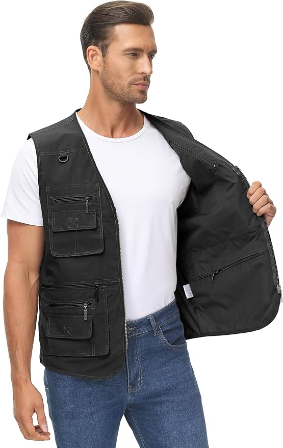 - Multi-pockets: Front pockets: 5 zipper pockets and 5 velcro pockets; Inner pockets: 2 upper slant zip pockets and 2 bottom pockets; The front large pocket can hold a pair of 10x42 binoculars; A lightweight vest could hold your wallet, cellphone, car keys, etc