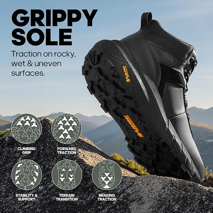 • Supportive & Breathable: These waterproof outdoor hiking boots for men are lined with a mesh-covered vegan leather insole that provides arch support while reducing moisture buildup. The EVA midsole greatly absorbs impact from uneven grounds while easing foot fatigue.