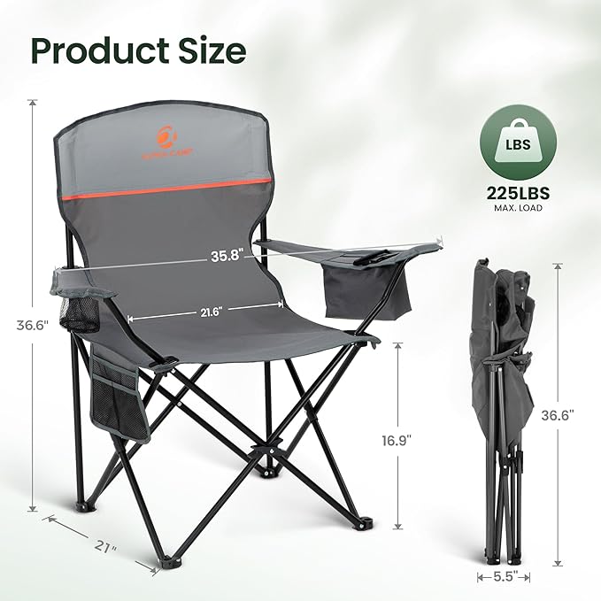 - Portable and Excellent: This portable camping chair is foldable. It is easy to set up and no tools required. This camping chairs for adults heavy duty with a carrying bag is easy to store and transport for travel or camping