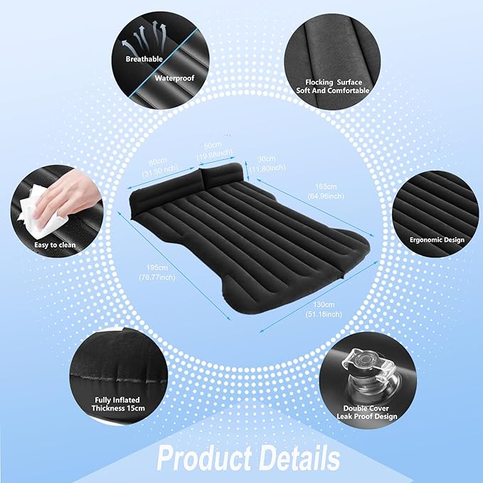 - COMFORTABLE & MOISTURE PROOF CAR AIR MATTRESS : This inflatable car camping mattress is made of skin-friendly flocking and thicked PVC waterproof material, the suv car mattress is cold-resistant to -25°C, soft to the touch, non-toxic, and odorless, more comfortable and durable. Moreover, the design of this car air mattress for camping conforms to ergonomics and effectively shock-absorbing, allowing your family and friends to rest well in the back seat or trunk on the traveling