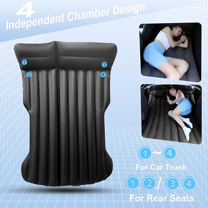 - 4 SEPARATE AIR CHAMBER: The inflatable car mattress features 4 independent air chamber. You can choose to fully inflate the car bed for car / truck bed mattress or partially inflate it to 40% or 60% for car air mattress back seat. This car camping mattress is perfect for long-distance self-driving enthusiasts as it provides a comfortable resting or playing space in the back seat or trunk,which can effectively reduce bumps and noise on the road while driving, allowing you or your family to sleep comfortably in the car.