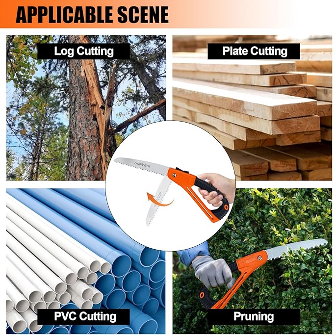 - 【Sharp and Durable Cutting Blade】This folding saw features an exceptional cutting blade with aggressive staggered teeth for fast and precise cutting. Whether you are pruning trees, cutting logs, or tackling PVC pipes, its triple-cut serrated edge ensures smooth performance.