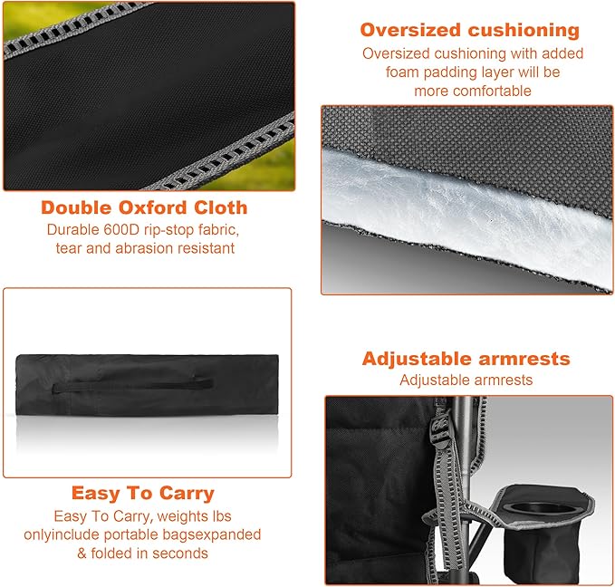 - Durable and Sturdy: Built to last, these camping chairs can support up to 400 lbs, thanks to their heavy-duty steel frame construction. Whether you're relaxing at the beach, fishing by the lake, or hiking in the mountains, these chairs provide the strength and stability you need for a comfortable experience.