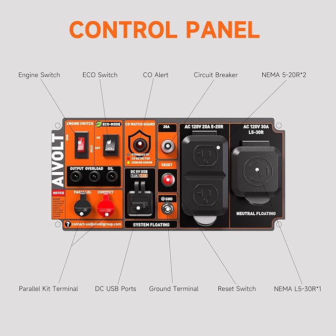 - 【5 Output Ports & Parallel Support】The inverter generator is equipped with 1 * 120V TT-30R receptacle, 2 * 120V 5-20R receptacles, 2 * 5V USB ports. With AIVOLT 120V parallel kit(optional), it is easy to double power output to meet your higher demands