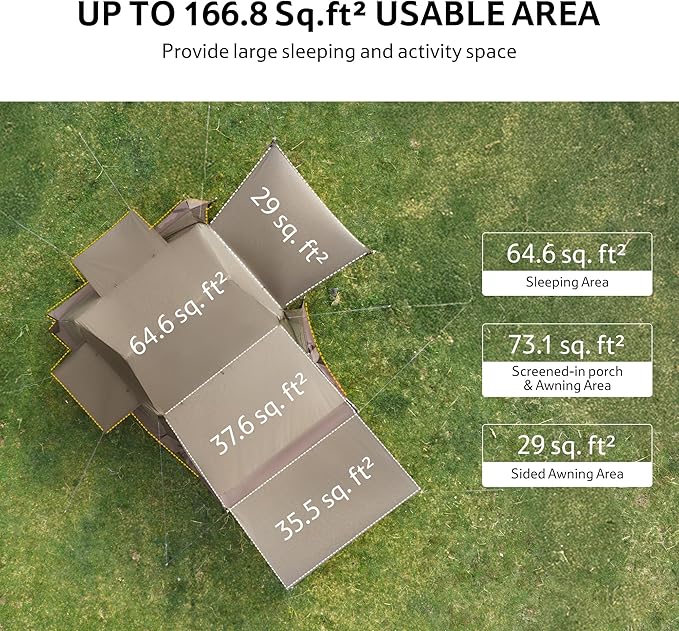 - Spacious Design with Screen Porch: 166.8 Sq.ft² total space (Sleeping Area: 64.6 Sq.ft² + Screen Porch: 37.6 Sq.ft²) fits 4 adults + camping gears. 70.8" ceiling height allows standing and walking around comfort. Detachable screen porch expands usable space (37.6 Sq.ft²) for gear storage or outdoor dining.
