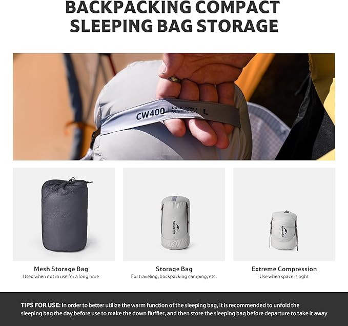 - TIPS FOR USE: In order to better utilize the warm function of the sleeping bag, it is recommended to unfold the sleeping bag the day before use to make the down fluffier, and then store the sleeping bag before departure to take it away. It is recommended to use the sleeping bag together with a Naturehike sleeping pad to maximize the warmth of the bag