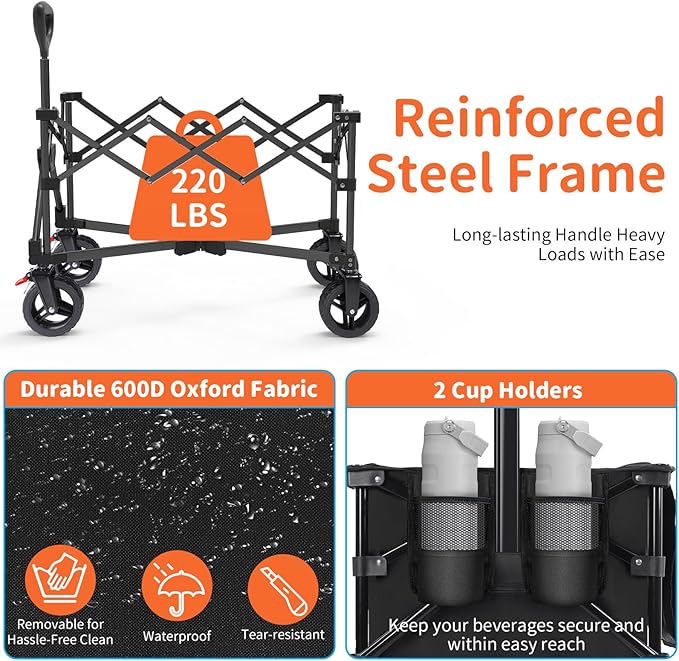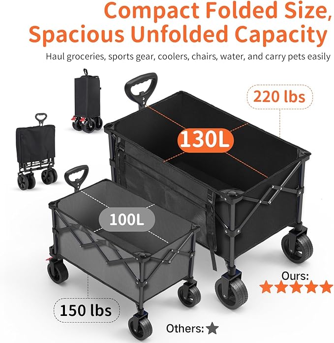 - Excellent Load Capacity & Storage Space: Our heavy duty wagon cart offers the perfect balance of capacity and durability for all your outdoor adventures. Boasting a 130L spacious capacity, grocery wagon has ample space for storing a lot of gear. Equipped with high-quality heavy duty metal frame to load up to 220 lbs, the double-layer thickened durable 600D Oxford fabric provides maximum tear resistance, and can be easily removed for easy cleaning, ensuring you can carry heavy loads with ease.