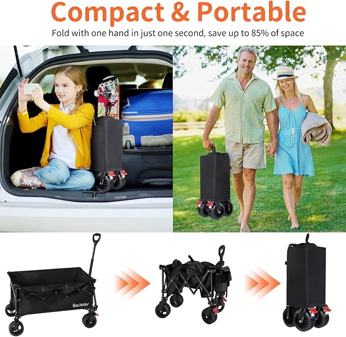 BELEEV Collapsible Wagon Cart, Heavy Duty Foldable Utility Cart with 6" All-Terrain Big Wheels, 130L Large Capacity, Side Pocket & Drink Holders for Beach Grocery Garden Camping Sports Shopping(Black)