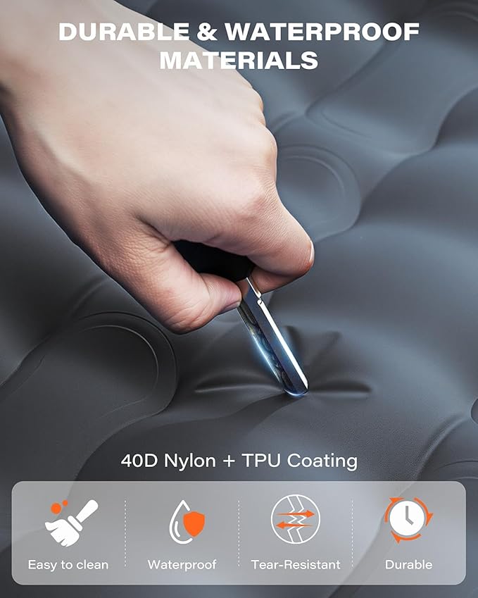 - 【Camping Grade Durable Material】: Camping mattress is built with tough 40D nylon and a TPU coating—tear-resistant, waterproof, and easy to clean. It supports up to 600 lbs, making it perfect for all body types. Heat-sealed edges prevent air leaks, even in rugged outdoor conditions.