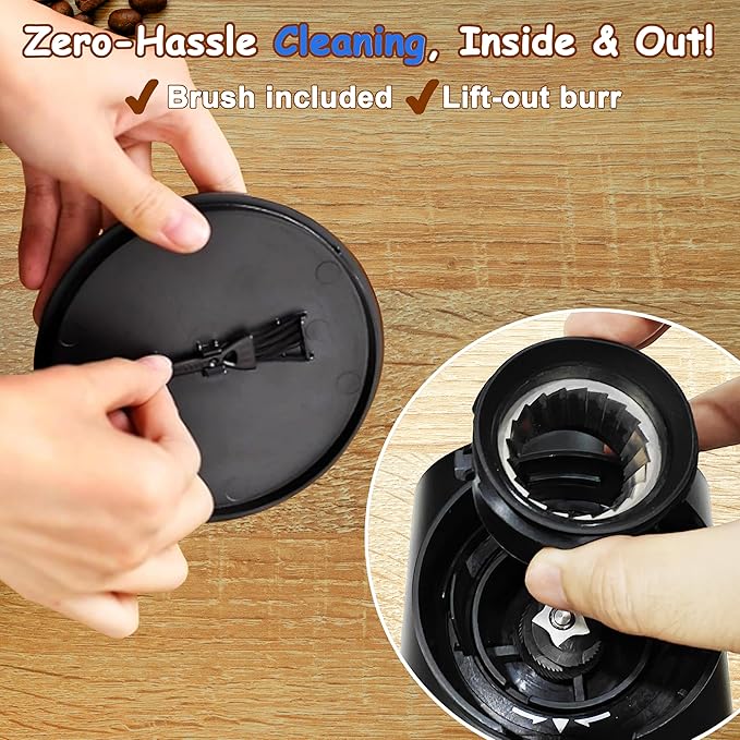 - 【ANTI-STATIC TECHNOLOGY & EASY TO CLEAN】Anti-static technology keeps the coffee chamber free of debris, preventing Ground coffee from flying around and staining the work surface. The coffee bean grinder includes a cleaning brush that cleans the removable upper burrs, hopper and resealable dust chamber in seconds.