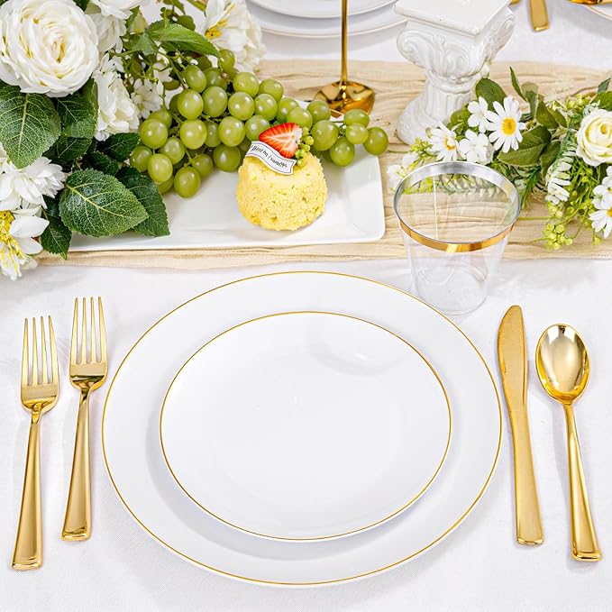 - QUALITY MATERIAL: These gold party plates are made of high-quality food-grade plastic, BPA-free! The white plates with gold trim can handle hot, cold, and wet food without leaking or spilling