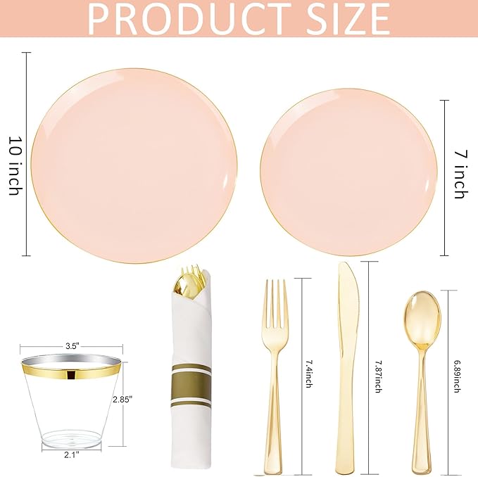 - WHAT YOU GET: KIRE 175 piece pink plates for party includes 25 10.25" dinner plates, 25 7.5" salad plates, 25 pre rolled napkins, 25 9oz cups, 25 knives, 25 forks, and 25 spoons