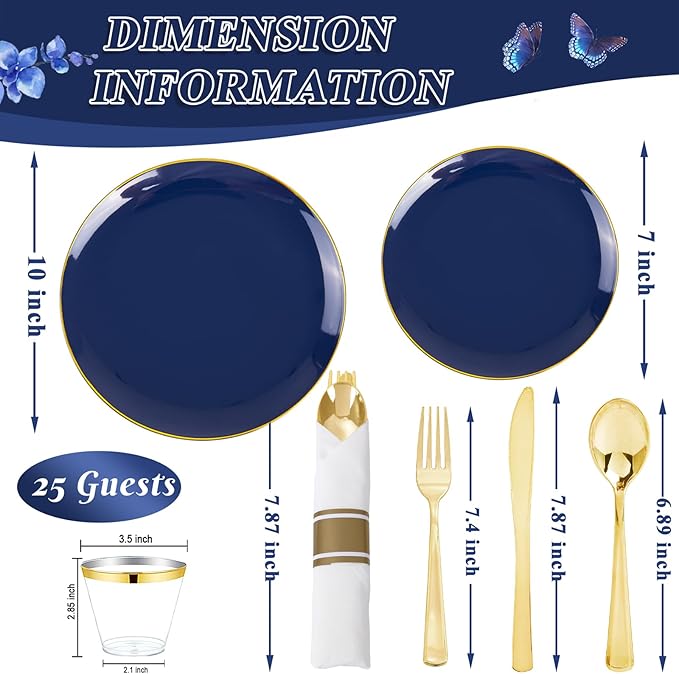 - Set For 25 Guests - KIRE 175pcs navy blue plates dinnerware include 25pcs dinner plates, 25pcs dessert plates, 25pcs pre rolled napkins with gold plastic silverware, 25pcs cups